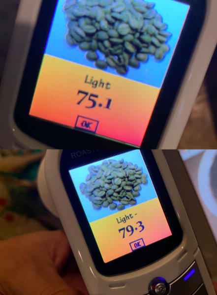 Agtron bean color value 75.1 (above image), Agtron ground color value 79.3 (below image), Roast Delta value 4.2.