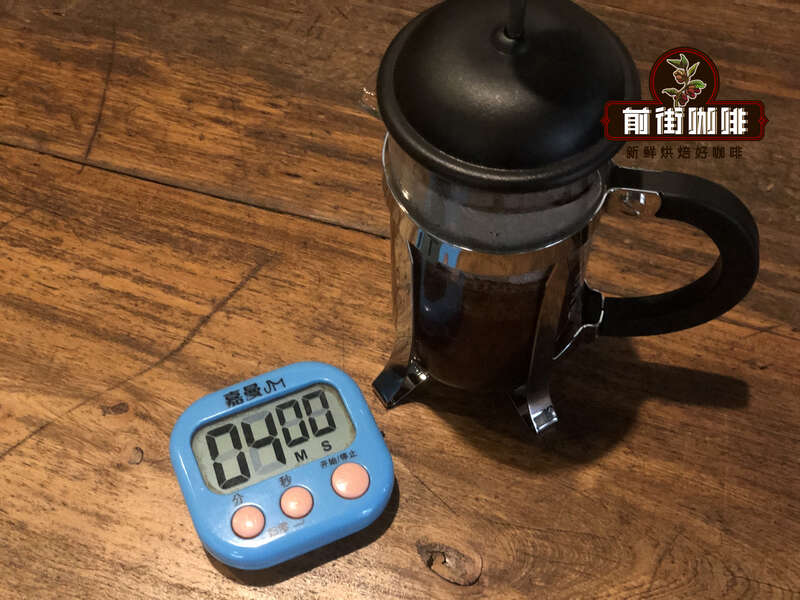 3. After four minutes, gently press down the plunger to about 1/4 of the pot's height to avoid fine particles at the bottom flowing upward.