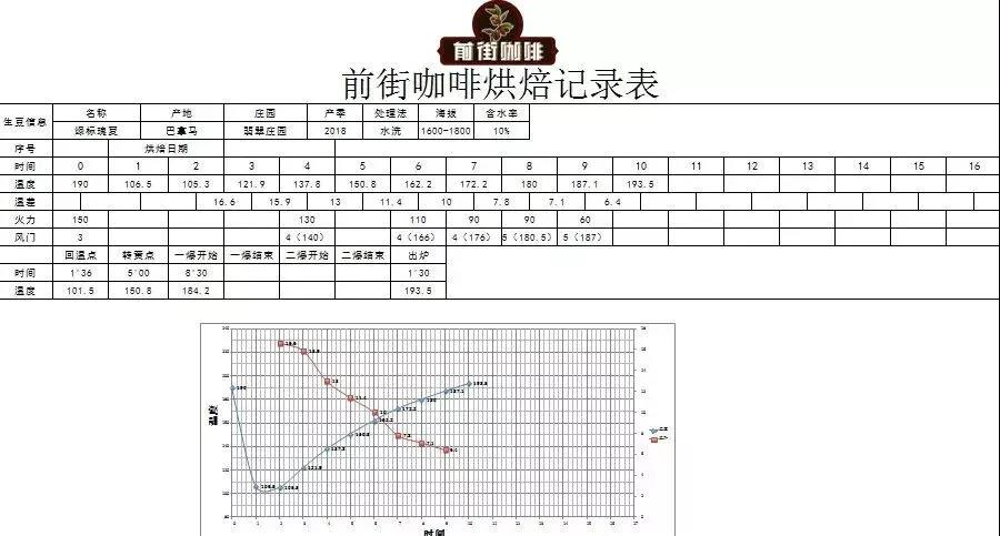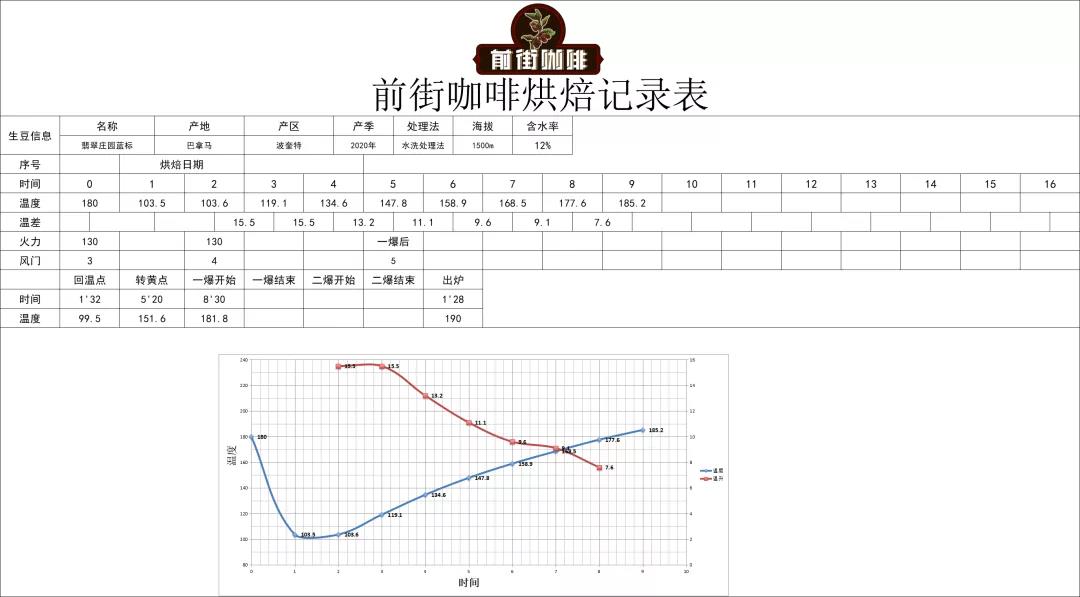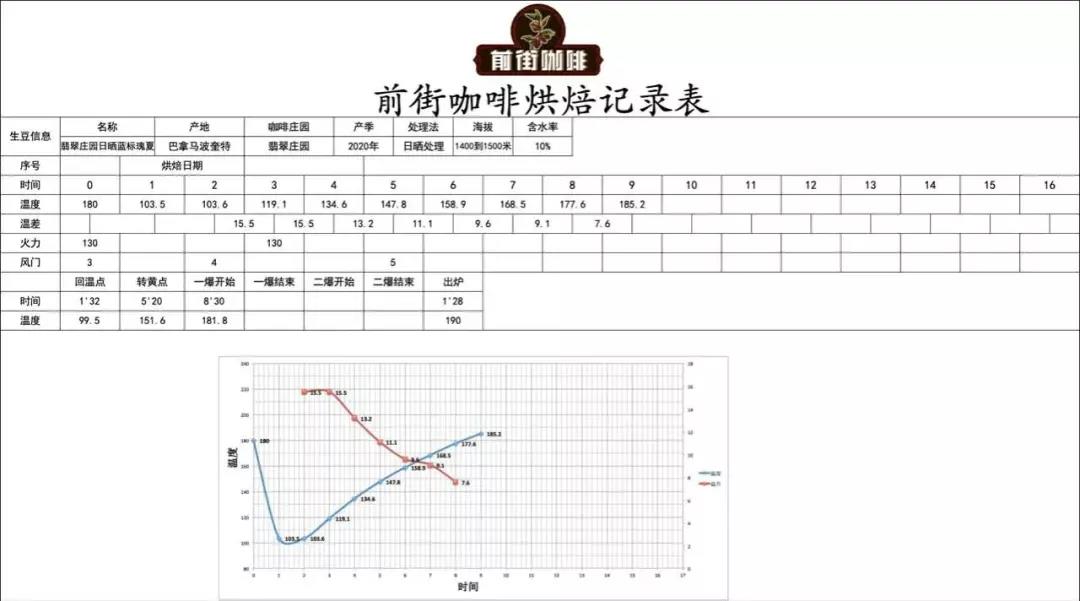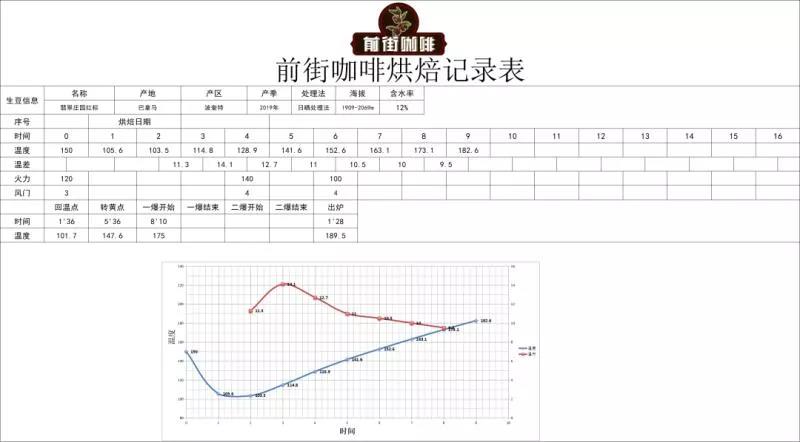 Heat to 150°C at entry,火力120, damper open to 3; Return temperature point at 1'36", when temperature reaches 140°C, open damper to 4, firepower unchanged; When temperature reaches 147.6°C, bean surface turns yellow, grassy aroma completely disappears, entering dehydration stage. When temperature reaches 150°C, adjust firepower to 100, damper unchanged; At 7'38", bean surface shows ugly wrinkles and black spots, toast aroma clearly transitions to coffee aroma, which can be defined as the prelude to first crack. At this time, listen carefully for the sound of first crack. First crack begins at 8'10", open damper to 4, develop for 1'28 after first crack, discharge at 189.5°C.