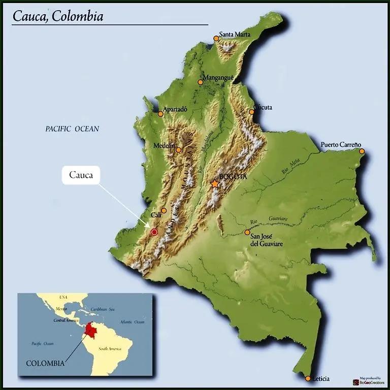 Cauca is a certified coffee origin region in Colombia, with an average altitude of 1758m, reaching up to 2100m at its highest points. The region's topography, precipitation, temperature, and volcanic soil create ideal conditions for coffee cultivation. 80% of the area consists of mountainous terrain, with parallel mountain ranges in the eastern and central regions, forming part of the Andes Mountains.