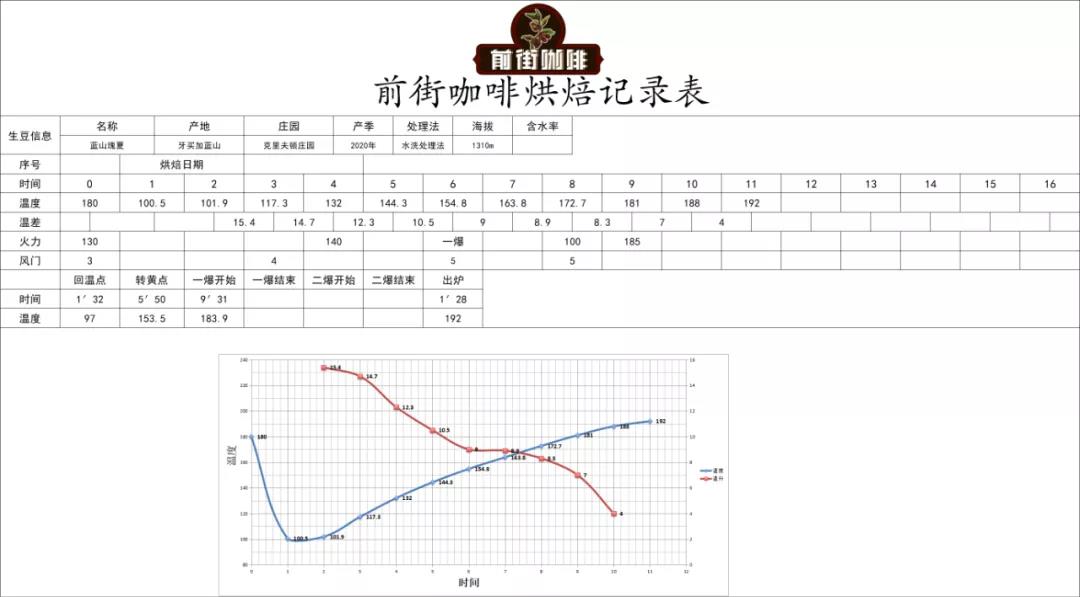 The beans were loaded into the drum at 180°C, with heat at 130 and damper opened to 3. The turning point was at 1'32", with the temperature at 97°C, heat unchanged. At 3 minutes, the damper was adjusted to 4, and at 4 minutes, the heat was increased to 140. When the drum temperature reached 153.5°C, the bean surface turned yellow, and the grassy aroma completely disappeared, entering the dehydration stage. At 8'36", ugly wrinkles and black patterns appeared on the bean surface, and the toast aroma clearly transformed into coffee aroma, which could be defined as the prelude to first crack. At this point, it's crucial to listen carefully for the sound of first crack. First crack began at 9'31", with 1'28" development after first crack, and the beans were dropped at 192°C.