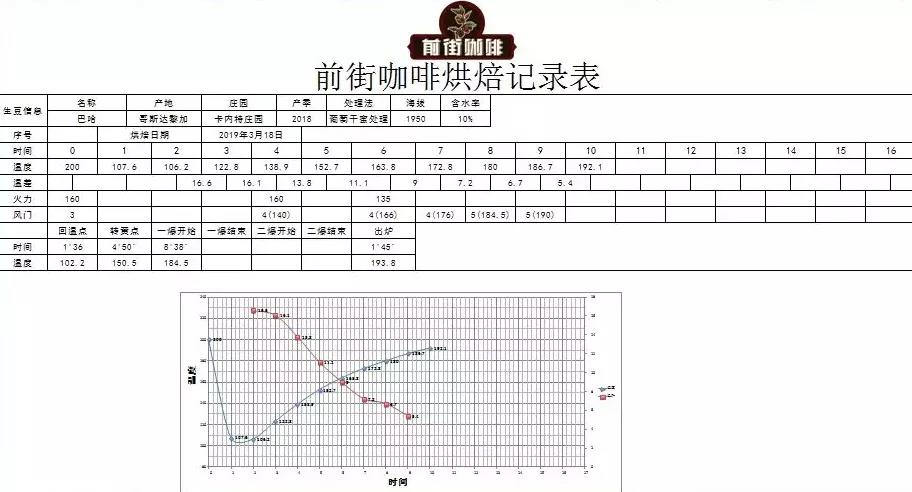 FrontStreet Coffee's roaster uses a Yangjia 800N semi-direct flame roaster with a batch size of 300g. The roaster is preheated to 200°C before charging the beans, with heat adjusted to 160 and damper opened to 3. The temperature return point is at 1'36", maintaining the heat. At 140°C, the heat remains at 160, and the damper opens to 4. At 4'50", the beans turn yellow, grassy aromas disappear, entering the dehydration stage. At 166°C, the heat is reduced to 135, with the damper remaining at 4.