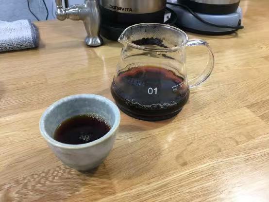 After finishing the dessert, I ordered a cup of Golden Mandheling. The young female owner brought out a ZERO JAPAN double-hole fan-shaped dripper, explaining while brewing that it was to highlight the sweetness of Golden Mandheling and make it smoother on the palate. She then specially took out a KONO dripper that hadn't been used for a long time to brew another cup for comparison. It was truly as she described!