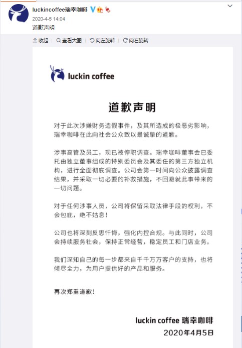 On April 5, Luckin Coffee issued an apology statement on its official Weibo account regarding the financial fraud incident.