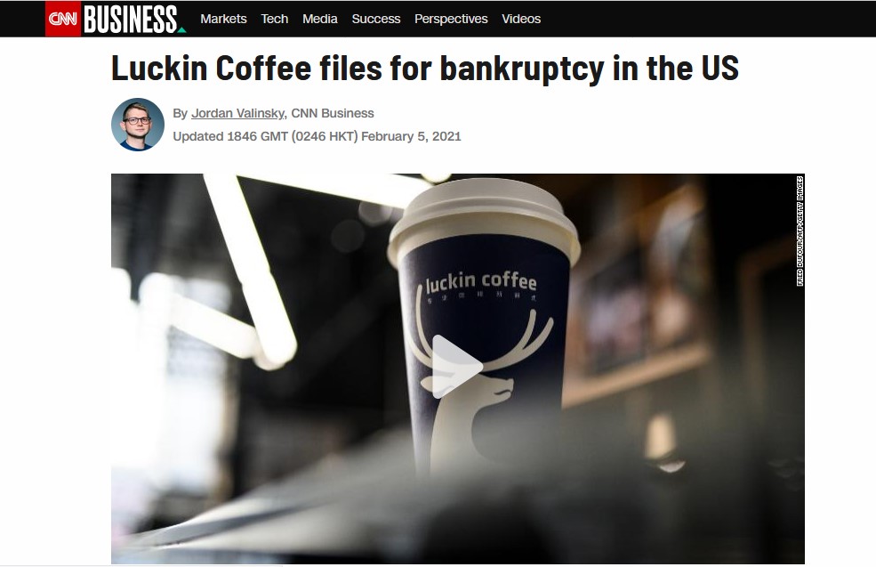 In February 2021, Luckin Coffee filed for bankruptcy protection in the United States.