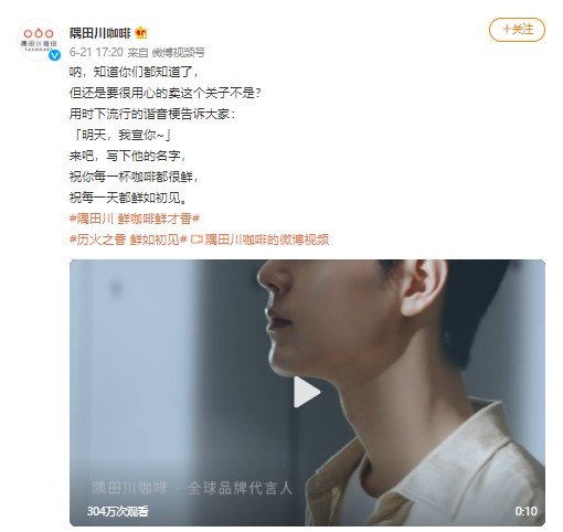 Since the brand discovered this unique lucky pattern, of course they had to use it. At 10:05 AM on June 22, Sumida River Coffee's official Weibo officially announced their global brand ambassador and released a promotional video.