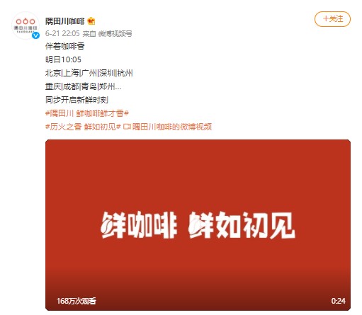 The final teaser post from Sumida River Coffee's official Weibo was issued at 10:05 PM that evening, announcing that the brand would place advertisements on LED screens in Beijing, Shanghai, Guangzhou, Shenzhen, Hangzhou, Chongqing, Chengdu, Qingdao, Zhengzhou, and other cities, simultaneously launching their "fresh moment." Observant followers noticed that Sumida River Coffee had discovered a lucky pattern - all the times of their official Weibo posts that day were carefully chosen. Arranging these times in sequence creates "100513145201005."