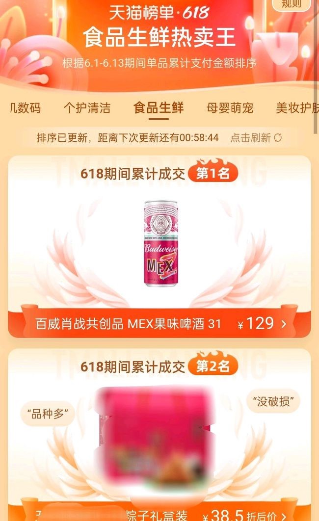 Xiao Zhan's previously endorsed Budweiser's fruit-flavored beer saw pre-sales on June 5, with pre-sale links removed on June 11, and officially launched on June 12. During the 618 Tmall rankings, its sales even surpassed zongzi (rice dumplings), securing the top position.