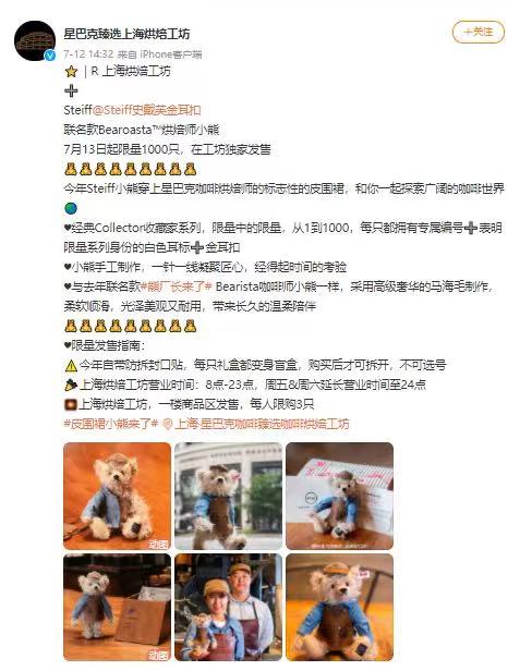 According to Starbucks Reserve Shanghai Roastery's official Weibo account, this bear doll is a collaboration between Starbucks Shanghai Roastery and Steiff, named "Bearoasta™ Baker Bear." It will be available for limited sale starting July 13th. This Bearoasta™ Baker Bear is globally limited to 1,000 pieces and can only be purchased in person at the Starbucks Shanghai Roastery.