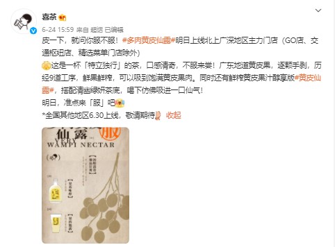 In this game of fierce competition among new-style tea brands, after the next season's phyllanthus was completely pre-ordered, another niche fruit from the south caught their attention. On June 24, 2021, Heytea posted a preview on their official Weibo account announcing the launch of wampee special drinks, stating that "Fleshy Wampee Nectar" would be first released on June 25, 2021, in four cities: Beijing, Shanghai, Guangzhou, and Shenzhen, with other cities following on June 30.