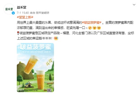 As leading players in the tea industry successfully created buzz with niche fruits, more and more tea brands are following this path. Recently, Yihetang also launched new tea beverages featuring fruits like jackfruit and lychee, which are all originally from southern regions.