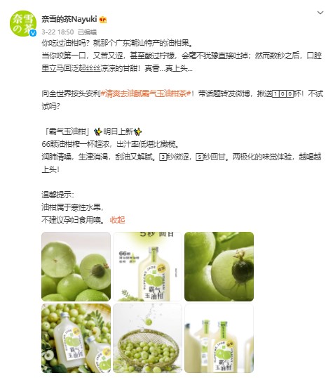 On March 22, 2021, Nayuki posted a preview of their new products on their official Weibo account. The new item at that time was the "Overbearing Phyllanthus Drink," which later became so popular that it frequently sold out at their stores. Subsequently, several new-style tea brands (such as Heytea, Coco, etc.) followed suit by launching their own phyllanthus tea beverages. The descriptions of phyllanthus special drinks all inevitably include words like "saliva-inducing" and "oil-scraping."