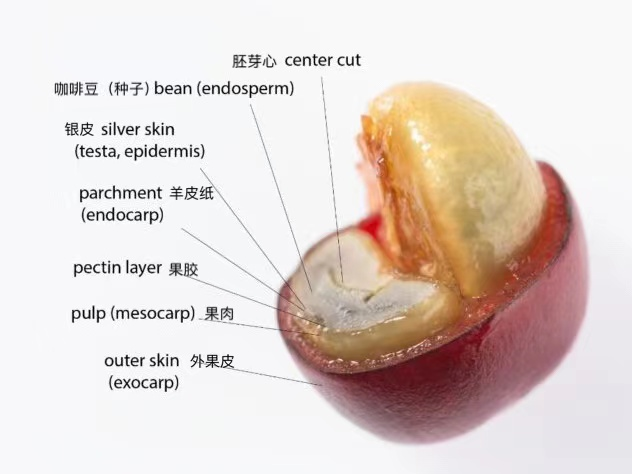 To understand coffee processing methods, we first need to understand the structure of coffee cherries: from the outside to the inside, the coffee cherry consists of skin, pulp, mucilage, parchment, silver skin, and finally our coffee bean. Therefore, the purpose of coffee processing is to remove all parts of the coffee cherry except the coffee bean and obtain the coffee bean.