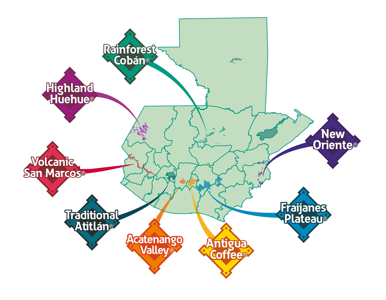 The Guatemalan Coffee Association established the Guatemalan Coffee Bean brand, defining coffees from eight different regions with the slogan "A Rainbow of Choices." These eight regions are divided into Antigua Classic, Huehuetenango, Rainforest Coban, Traditional Atitlan, Fraijanes Plateau, Volcanic San Marcos, Acatenango, and New Oriente coffee producing regions.