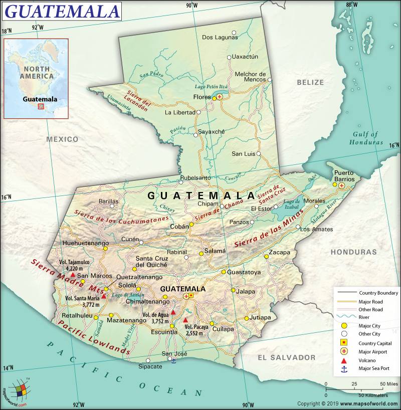 Guatemala is located in the southern part of the North American continent and northwestern Central America. The country borders Mexico to the west and north, and connects with Honduras and El Salvador to the southeast. Two-thirds of Guatemala's terrain consists of mountains and plateaus, with western and southern regions belonging to the volcanic belt, containing over thirty volcanoes.