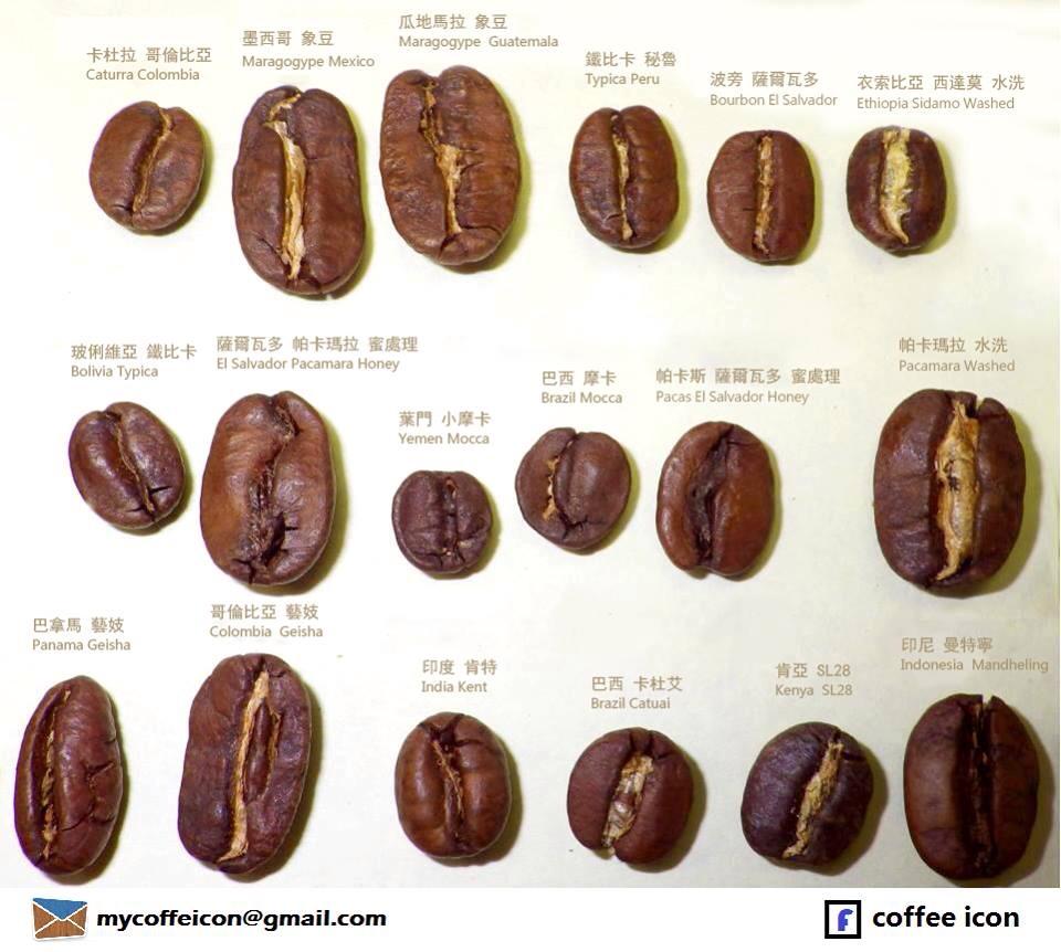 First discovered in 1870 in the Maragogype producing area of Bahia state, northeastern Brazil. The beans are at least three times larger than regular Arabica beans, hence the name. Maragogype has poor flavor at low altitudes but produces better flavor at high altitudes with mild acidity and pleasant sweet aroma. (Left side of image shows Maragogype)