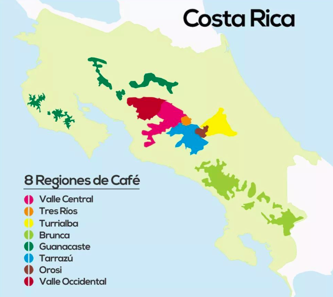 Costa Rica began growing coffee as early as two hundred years ago, first planted on the slopes of Poas and Barva volcanoes, which is what we now call the Central Valley. Currently, Costa Rica has eight main producing regions: West Valley, Central Valley, Tarrazu, Tres Rios, Orosi, Brunca, Turrialba, and Guanacaste.