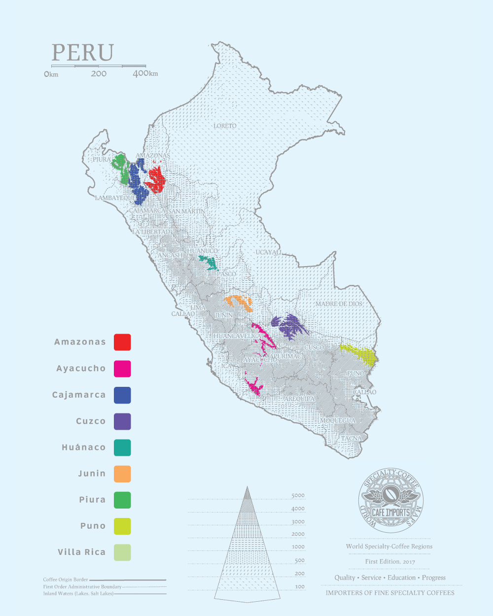 Peru's coffee industry is dominated by small farmers, each with less than two hectares of land, producing about 3,000 pounds of coffee per hectare. Organic cultivation has a very long and quite common history in Peru. However, in recent years due to climate change, coffee leaf rust has spread across various countries, and because of organic cultivation methods, this has also caused significant production reductions in Peruvian coffee. Peruvian coffee is shade-grown in high-altitude areas, primarily with Arabica varieties. With slow maturation, the beans here have higher density and quite diverse flavor profiles. Among these, the highest altitude and most important coffee-growing region is Chanchamayo, located in the central highlands on the eastern side of the Andes. Following this are Amazonas and San Martin, located in the northern highlands on the eastern side of the Andes.