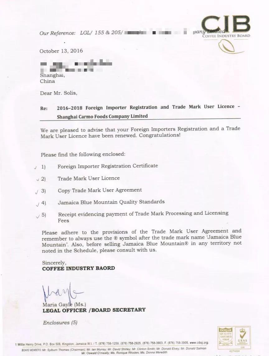 Quality proof certificates indicate time and quantity. The Jamaican Coffee Board randomly selects a package from submitted Blue Mountain coffee for inspection. If it meets Blue Mountain coffee conditions, a certificate is issued.